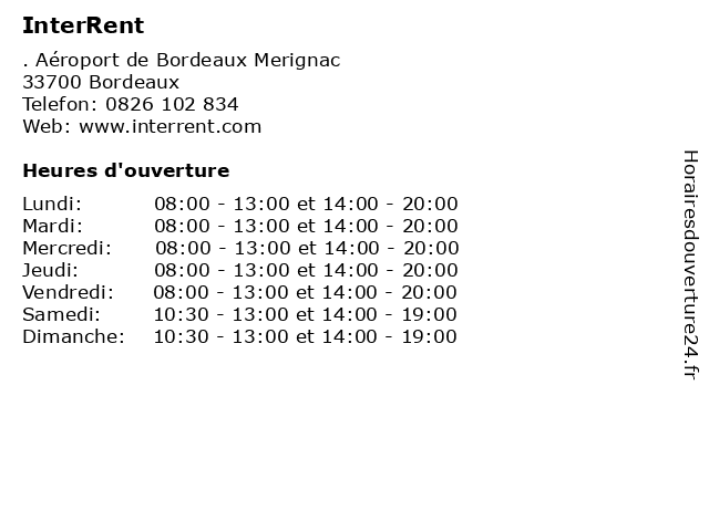 1 Location de voitures Aéroport de Bordeaux - InterRent (Distance: 2,08 km) Bordeaux Merignac Aéroport 34 Avenue Roland Garros, 33700 Mérignac aéroport, bordeaux, de, interrent, location, voitures 2 Avis (Distance: 0,00 km) - Route de l'Aéroport, 33700 Bordeaux agence, avis, location, utilitaire, voiture, véhicule 3 Enterprise Rent-a-Car (Distance: 1,69 km) 272 Avenue Argonne,, 33700 Merignac car, de voiture, enterprise, large gamme de véhicules, location de véhicule utilitaire, nos meilleurs, rent 4 Avis (Distance: 4,29 km) 8 Rue Joseph Cugnot, 33700 Mérignac agence, avis, location, utilitaire, voiture, véhicule 5 Fraikin (Distance: 10,22 km) s/n Z.I. de Campilleau, 33520 Bruges fraikin, location, services, utilitaire, véhicules 6 Alamo - Enterprise Rent-A-Car (Distance: 12,26 km) 137 Rue des Terres de Bordes, 33800 Bordeaux agence, alamo, car, enterprise, location, rent, utilitaire, voiture, véhicule |