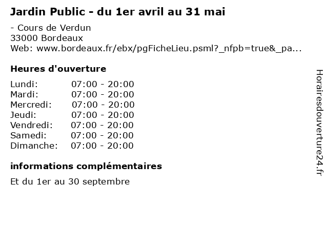 1 Les Jardins de Bordeaux - Jardin Public (01/04-31/05) (Distance: 0,00 km) . Cours de Verdun, 33000 Bordeaux 01/04, 31/05, bordeaux, de, jardin, jardins, les, mairie, parc, public, services 2 Les Jardins de Bordeaux - Jardin Public (01/07-31/08) (Distance: 0,00 km) . Cours de Verdun, 33000 Bordeaux 01/07, 31/08, bordeaux, de, jardin, jardins, les, mairie, parc, public, services 3 Les Jardins de Bordeaux - Jardin Public (01/10-31/10) (Distance: 0,00 km) . Cours de Verdun, 33000 Bordeaux 01/10, 31/10, bordeaux, de, jardin, jardins, les, mairie, parc, public, services 4 Les Jardins de Bordeaux - Jardin de la Mairie (15/02-31/10) (Distance: 0,89 km) 20 Cours d'Albret, 33000 Bordeaux 15/02, 31/10, bordeaux, de, jardin, jardins, la, les, mairie, parc, services 5 Les Jardins de Bordeaux - Dames de la Foi (01/04-31/05) (Distance: 1,66 km) . Rue St Genès, 33000 Bordeaux 01/04, 31/05, bordeaux, dames, de, foi, jardin, jardins, la, les, mairie, parc, services 6 Les Jardins de Bordeaux - Dames de la Foi (01/07-31/05) (Distance: 1,66 km) . Rue St Genès, 33000 Bordeaux 01/07, 31/05, bordeaux, dames, de, foi, jardin, jardins, la, les, mairie, parc, services |