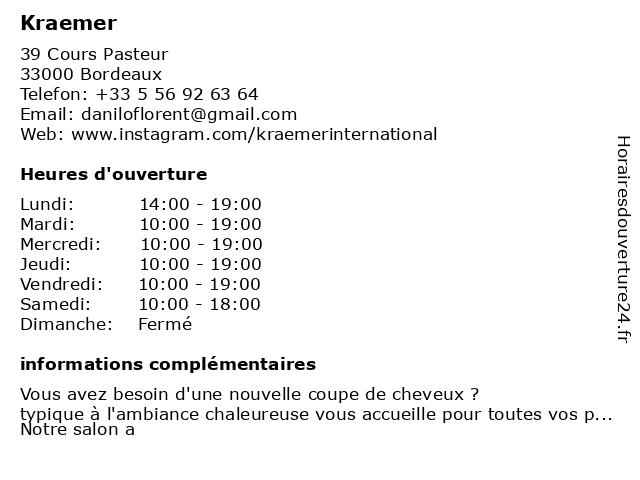 1 Kraemer Paris (Distance: 46,04 km) 61 rue de la République, 33230 Saint Medard de Guizieres beaute, coiffure, kraemer, paris, services |
