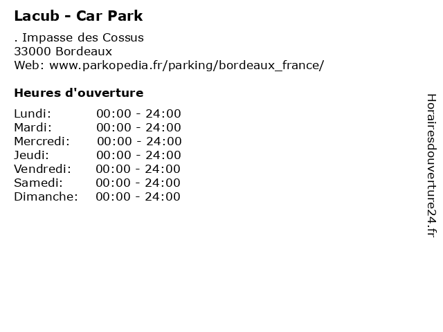 1 Lacub - Car Park (Distance: 0,00 km) . Impasse des Cossus, 33000 Bordeaux automobile, car, lacub, park, parking, services 2 Lacub - Car Park (Distance: 0,78 km) . Cours Marc Nouaux, 33000 Bordeaux automobile, car, lacub, park, parking, services 3 Lacub - Car Park (Distance: 1,57 km) . Avenue Emile Counord, 33300 Bordeaux automobile, car, lacub, park, parking, services 4 Lacub - Car Park (Distance: 2,27 km) . Rue de Doumerc, 33000 Bordeaux automobile, car, lacub, park, parking, services 5 Lacub - Car Park (Distance: 2,37 km) . Rue d'Ornano, 33000 Bordeaux automobile, car, lacub, park, parking, services 6 Lacub - Car Park (Distance: 2,37 km) . Rue d'Ornano, 33000 Bordeaux automobile, car, lacub, park, parking, services |