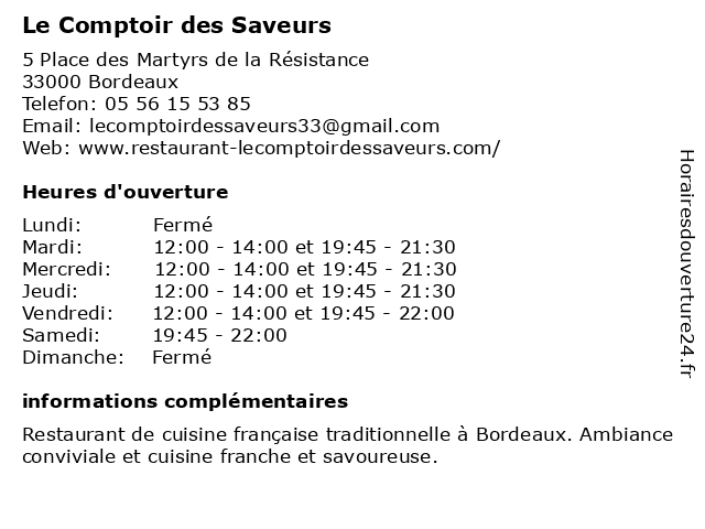 Termes de recherche pour Le Comptoir des Saveurs:restauration, restaurant, café, le, bar, des, bistrot, brasserie, comptoir, pub, saveurs, resto, bistro |