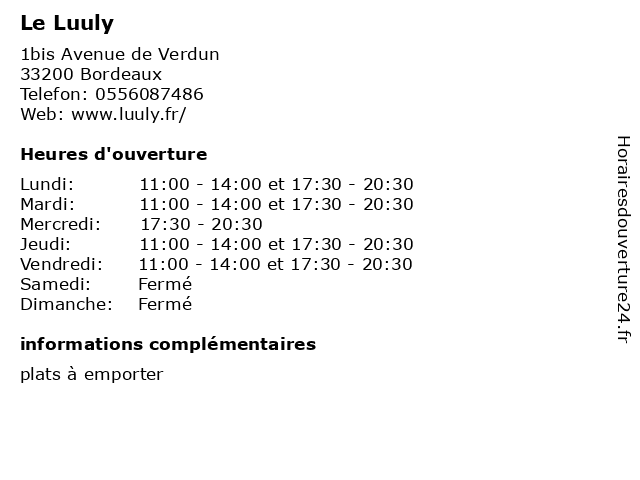 | Mardi | 11:00-14:00 et 17:30-20:30 |