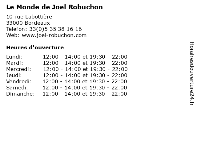 | Mardi | 12:00-14:00 et 19:30-22:00 |