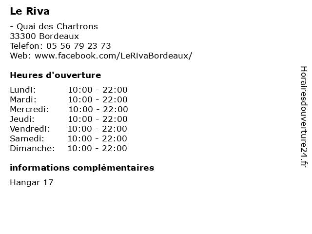 1 Le Riva (Distance: 0,72 km) 17 Hangar, 33000 Bordeaux boissons, brasserie, café, le, les desserts, les repas, restaurant, riva 2 SAS Maison Riva (Distance: 1,23 km) 5 Allées de Tourny, 33000 Bordeaux aménagements, bordeaux, charpentes, couvertures, couvreur, fenêtre, maison, riva, sas, toiture 4 Immobilier Riva (Distance: 9,47 km) 32 bis Avenue de la Libération, 33360 Latresne agence, gestion, immobilier, location, riva, transaction, vente 6 Belle Riva Glacier (Distance: 51,85 km) 17 boulevard Promenade Veyrier Montagnères, 33120 Arcachon belle, cornets, crepes, gaufres, glaces, glacier, riva, snacking, sorbets |