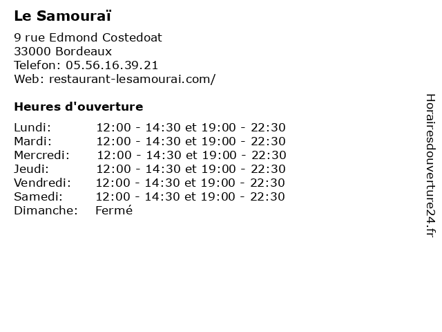| Mardi | 12:00-14:30 et 19:00-22:30 |