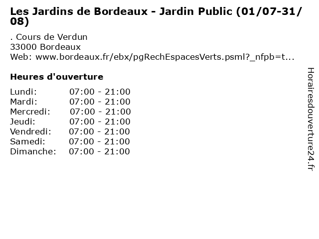 1 Les Jardins de Bordeaux - Jardin Public (01/04-31/05) (Distance: 0,00 km) . Cours de Verdun, 33000 Bordeaux 01/04, 31/05, bordeaux, de, jardin, jardins, les, mairie, parc, public, services 2 Les Jardins de Bordeaux - Jardin Public (01/10-31/10) (Distance: 0,00 km) . Cours de Verdun, 33000 Bordeaux 01/10, 31/10, bordeaux, de, jardin, jardins, les, mairie, parc, public, services 3 Les Jardins de Bordeaux - Jardin de la Mairie (15/02-31/10) (Distance: 0,89 km) 20 Cours d'Albret, 33000 Bordeaux 15/02, 31/10, bordeaux, de, jardin, jardins, la, les, mairie, parc, services 4 Les Jardins de Bordeaux - Dames de la Foi (01/04-31/05) (Distance: 1,66 km) . Rue St Genès, 33000 Bordeaux 01/04, 31/05, bordeaux, dames, de, foi, jardin, jardins, la, les, mairie, parc, services 5 Les Jardins de Bordeaux - Dames de la Foi (01/07-31/05) (Distance: 1,66 km) . Rue St Genès, 33000 Bordeaux 01/07, 31/05, bordeaux, dames, de, foi, jardin, jardins, la, les, mairie, parc, services 6 Les Jardins de Bordeaux - Parc Bordelais (01/04-31/05) (Distance: 1,89 km) . Rue du Bocage, 33000 Bordeaux 01/04, 31/05, bordeaux, bordelais, de, jardin, jardins, les, mairie, parc, services |