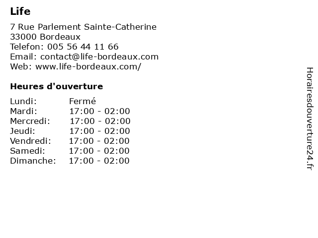 | 1 Le Life (Distance: 0,00 km) 7 Rue Parlement Sainte-Catherine, 33000 Bordeaux bars, business, le, life, liquors 3 Happy Life Coaching (Distance: 1,51 km) 44 Rue de Strasbourg, 33000 Bordeaux change de vie, changer sa vie, changer vie, coaching, happy, life, praticien pnl bordeaux, programme changement 4 Le Chien de Pavlov (Distance: 0,05 km) 45/47 Rue de la Devise, 33000 Bordeaux café, chien, cocktails, cuisine, de, française, le, pavlov, restaurant, restauration 5 C-Mariage (Distance: 0,50 km) 50 bis Cours d'Alsace et Lorraine, 33000 Bordeaux accessoires, cocktails, costume, mariage, robe 6 |