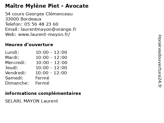 1 Maître Mylène Da Ros - Avocate (Distance: 0,58 km) 60 rue Bouffard, 33000 Bordeaux avocate, avocats, civils, da, droits, juridiques, maître, mylène, ros 2 Manon Piet - Auxiliaire Vétérinaire (Distance: 1,78 km) 63 Avenue Thiers, 33100 Bordeaux animaux, auxiliaire, clinique, manon, médical, piet, santé, soins, vétérinaire 3 Dr. Mylène Annonay - Cancérologue médical (Distance: 2,21 km) 229 cours de l’Argonne, 33076 Bordeaux annonay, cancérologue, consultation, docteur, dr., med, mylene, mylène, médecin, médecine, médical, traitement 4 Mylène Monnet - Pédicure-podologue (Distance: 14,56 km) 2ter Rue du 19 Mars 1962, 33450 Saint-Loubès monnet, mylène, pedicure, pied, podologue, pédicure, sante 5 Maître Pierre Charruault - Avocat (Distance: 0,07 km) 42 Cours Georges Clémenceau, 33000 Bordeaux avocat, avocate, avocats, charruault, civils, droits, juridiques, maître, pierre 6 Maître Hervé Maire - Avocat (Distance: 0,13 km) 3 rue Michel Montaigne, 33000 Bordeaux avocat, avocate, avocats, civils, droits, hervé, juridiques, maire, maître |
