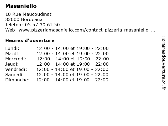 | Dimanche | 12:00-14:00 et 19:00-22:00 |