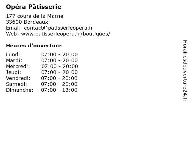 1 Opéra Pâtisserie (Distance: 1,69 km) 69 cours d'Albret, 33000 Bordeaux boulangerie, gâteaux, opera, opéra, pâtisserie 2 Opéra Pâtisserie (Distance: 4,51 km) 44 Avenue du Général Leclerc, 33200 Bordeaux boulangerie, gâteaux, opera, opéra, pâtisserie 3 Opéra Pâtisserie (Distance: 7,82 km) 2 Avenue Gustave Eiffel, 33600 Pessac boulangerie, gâteaux, opera, opéra, pâtisserie 4 Oven Heaven La Pâtisserie (Distance: 0,62 km) 51 Cours de la Marne, 33800 Bordeaux biscuits, chocolats, gâteaux, heaven, la, oven, pâtisserie 5 Pâtisserie Opéra (Distance: 0,94 km) 20 Place de la Victoire, 33000 Bordeaux artisanale, carte, desserts, opera, opéra, patisserie, pâtisserie 6 Pâtisserie S (Distance: 1,18 km) 8 Cours Alsace et Lorraine, 33000 Bordeaux pâtisserie, s., salon, thé, viennoiseries |