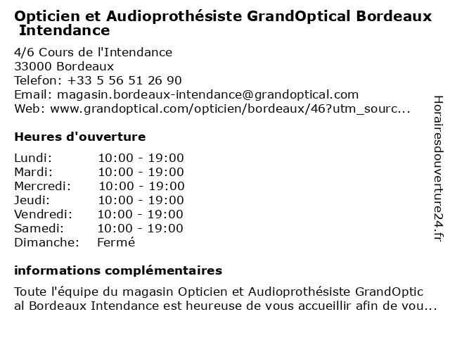 1 Opticien Bordeaux Intendance GRANDOPTICAL (Distance: 0,00 km) 4/6 Cours De L'intendance, 33000 Bordeaux bordeaux, grandoptical, intendance, magasin de lunettes de soleil, opticien 2 Lissac l'Opticien & Audioprothésiste Bordeaux et appareil auditif (Distance: 0,22 km) 38 Cours de l'Intendance, 33000 Bordeaux appareil, appareil auditif, audioprothésiste, auditif, bordeaux, et, l'opticien, lentilles de contact, lissac, lissac audition, lunettes de soleil, lunettes de vue, opticien, opticien lissac 3 Canelés Baillardran Bordeaux Intendance (Distance: 0,29 km) 55 Cours de l'Intendance, 33000 Bordeaux baillardran, bordeaux, canelés, intendance 4 Opticien Générale d'Optique (Distance: 0,44 km) 112 Rue Sainte-Catherine, 33000 Bordeaux d'optique, générale, opticien 5 Atol Mon Opticien Bordeaux - Alsace Lorraine (Distance: 0,49 km) 121 Cours d'Alsace-et-Lorraine, 33000 Bordeaux alsace, atol, atol les opticiens, atol mon opticien, bordeaux, lentilles, lorraine, lunettes de soleil, lunettes de vue, mon, opticien, opticien bordeaux 6 Atol Mon Opticien Bordeaux - Alsace Lorraine (Distance: 0,49 km) 121 Cours d'Alsace-et-Lorraine, 33000 Bordeaux alsace, atol, atol les opticiens, atol mon opticien, bordeaux, lentilles, lorraine, lunettes de soleil, lunettes de vue, mon, opticien, opticien bordeaux |