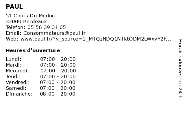 1 PAUL (Distance: 0,56 km) 75 Cours Portal, 33000 Bordeaux boulangeries, boutique de desserts, café, paul, restaurant à emporter 2 PAUL (Distance: 1,71 km) 1 Place De Tourny Cours De Tournon, 33000 Bordeaux boulangeries, boutique de desserts, café, paul, restaurant à emporter 3 PAUL (Distance: 2,45 km) Centre Commercial Auchan \, 33000 Bordeaux boulangeries, boutique de desserts, café, paul, restaurant à emporter 4 PAUL (Distance: 2,61 km) 2 Rue Claude Bonnier, 33000 Bordeaux boulangeries, boutique de desserts, café, paul, restaurant pour le brunch, restaurant pour le petit-déjeuner, restaurant à emporter, salon de thé, snack 5 Paul (Distance: 2,79 km) . Avenue Quarante Journaux, 33300 Bordeaux cafe, chaussures, enfants, homme, mode femme, paul, restaurant, sport 6 Paul (Distance: 3,27 km) 330 Avenue de la Libération, 33110 Le Bouscat pains, patisserie, paul, traiteur, viennoiserie |
