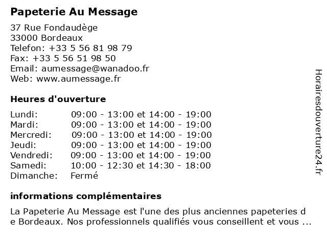 1 Comptoir Bordelais De Papeterie (Distance: 2,66 km) 2 Bis Rue Jeanne Lejeune, 33520 Bruges bordelais, comptoir, de, papeterie 2 Comptoir Bordelais De Papeterie (Distance: 2,66 km) 2 Bis Rue Jeanne Lejeune, 33520 Bruges bordelais, comptoir, de, papeterie 3 Comptoir Bordelais De Papeterie (Distance: 2,66 km) 2 Bis Rue Jeanne Lejeune, 33520 Bruges bordelais, comptoir, de, papeterie 4 Librairie Papeterie St Aignan LPSA (Distance: 14,18 km) 31 Avenue de la République, 33450 Saint-Loubès aignan, librairie, lpsa, papeterie, st 5 Jardin Public - du 1er avril au 31 mai (Distance: 0,17 km) - Cours de Verdun, 33000 Bordeaux 1er, 31, au, avril, du, jardin, jardins, mai, parcs, public 6 Au Plaisir Du Collectionneur (Distance: 0,24 km) 37 Rue Lafaurie de Monbadon, 33000 Bordeaux au, collectionneur, du, plaisir |