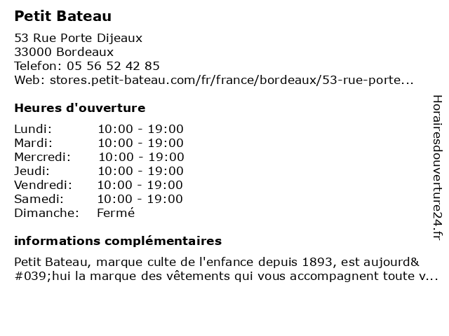 | 1 Petit Bateau (Distance: 0,00 km) 53 rue Porte Dijeaux, 33000 Bordeaux bateau, children's clothing, men's clothing, petit, women's clothing 2 Petit Bateau (Distance: 0,18 km) 19 Rue Ste Catherine, 33000 Bordeaux bateau, magasin de vêtements pour enfants, magasin de vêtements pour femmes, mode, petit 3 Petit Bateau (Distance: 0,22 km) 19 rue Ste Catherine, 33056 Bordeaux bateau, children's clothing, men's clothing, petit, women's clothing 4 Petit Bateau (Distance: 0,54 km) 57 Rue du Château d'Eau, 33000 Bordeaux bateau, cafe, chaussures, enfants, homme, lingerie, mode femme, petit, restaurant, service 5 Petit Bateau (Distance: 5,42 km) . Chemin de Tartifume, 33324 Begles accessoires, bateau, cafe, deco, enfants, femme, mode, petit, restaurant, shopping 6 Petit Bateau (Distance: 6,25 km) Centre Commercial Rives D'arcins, 33130 Bègles bateau, magasin de t-shirts, magasin de vêtements pour enfants, magasin de vêtements pour femmes, mode, petit |