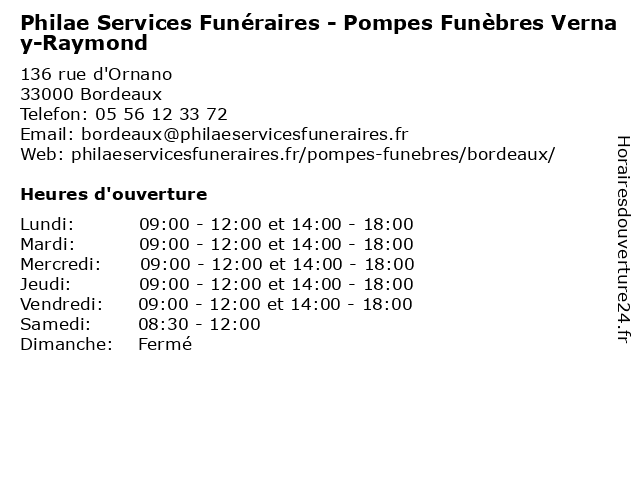1 Pompes Funèbres Roc-Eclerc (Distance: 0,33 km) 75 Rue Général de Larminat, 33000 Bordeaux articles funéraires, assistance rapatriement, démarches admnistratives, eclerc, fleurs fraîches, funèbres, gestion des obsèques, pompes, prévoyance obsèques, roc, travaux de marbrerie et cimetière 2 Pompes Funèbres Quintana (Distance: 0,68 km) 81 Cours d'Albret, 33000 Bordeaux funèbres, pompes, quintana 3 Pompes Funèbres de France (Distance: 0,82 km) 23 Boulevard George V, 33000 Bordeaux crémation, de, france, funèbres, funéraires, inhumation, philae, pompes, salons funéraires, services 4 Maître Marie-Anne Raymond - Avocate (Distance: 1,06 km) 8 rue Paul Louis Lande, 33000 Bordeaux anne, avocate, avocats, civils, droits, juridiques, marie, maître, raymond 5 Dr Nathalie Raymond - Pneumologue (Distance: 1,45 km) 138 Avenue de la République, 33200 Bordeaux consultation, docteur, dr, med, médecin, nathalie, pneumologue, raymond, traitement 6 PFG Services Funéraires (Distance: 1,91 km) 114 Cours Gambetta, 33400 Talence funeraires, funéraires, marbrerie, pfg, plaque funéraire, pompes funèbres, services |