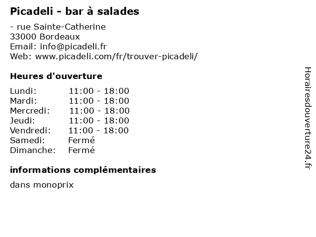 1 Picadeli - bar à salades (Distance: 0,25 km) - place des Grands Hommes, 33000 Bordeaux bar, boisson, fastfood, picadeli, restauration, salades 2 Picadeli - bar à salades (Distance: 0,81 km) 36bis cours Maréchal Juin, 33000 Bordeaux bar, boisson, fastfood, picadeli, restauration, salades 3 Picadeli - bar à salades (Distance: 0,99 km) 5 rue Robert Lateulade, 33000 Bordeaux bar, boisson, fastfood, picadeli, restauration, salades 4 Picadeli - bar à salades (Distance: 2,08 km) - Rue Grateloup, 33000 Bordeaux bar, boisson, fastfood, picadeli, restauration, salades 5 Picadeli - bar à salades (Distance: 6,07 km) - Rue des Poilus, 33600 Pessac bar, boisson, fastfood, picadeli, restauration, salades 6 Picadeli - bar à salades (Distance: 8,12 km) 1 avenue Gustave Eiffel, 33600 Pessac bar, boisson, fastfood, picadeli, restauration, salades |