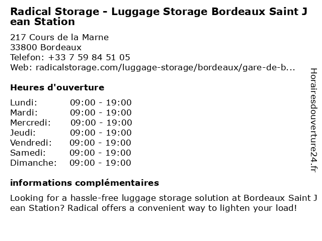 1 Nannybag Luggage Storage - Gare de Bordeaux St-Jean (Distance: 0,01 km) 217 Cr De La Marne, 33800 Bordeaux bordeaux, de, gare, jean, luggage, nannybag, st, storage 2 Onepark / Saint Jean Parking (Distance: 0,12 km) 7 Rue Saint-Vincent de Paul, 33800 Bordeaux jean, onepark, parking, saint, services 3 Radical Storage - Luggage Storage Bordeaux Train Station (Distance: 0,13 km) 7 Place Casablanca, 33800 Bordeaux bordeaux, luggage, luggage storage, luggage storage near me, radical, station, storage, train 5 Luggage Storage Bordeaux Saint-Jean - Radical Storage (Distance: 0,15 km) 50 Rue de Tauzia, 33800 Bordeaux bordeaux, jean, luggage, luggage storage, luggage storage near me, radical, saint, storage 6 Radical Storage - Luggage Storage Saint Jean Station (Distance: 0,16 km) 41 Rue Eugène le Roy, 33800 Bordeaux jean, luggage, luggage storage, luggage storage near me, radical, saint, station, storage |