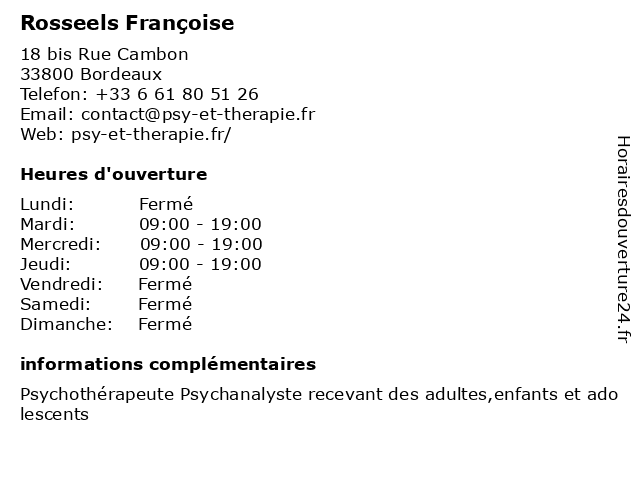 1 Françoise Fontich - Psychologue (Distance: 0,81 km) 15 Rue Vilaris, 33800 Bordeaux fontich, francoise, françoise, psy, psychiatre, psychologue, sante, soins 2 Françoise Risch - Psychologue (Distance: 1,56 km) 3ter Place de la Victoire, 33000 Bordeaux françoise, médecin, médecine, médical, pharmaceutique, psychologue, risch, secretariat, secrétariat, traitement 3 Françoise Guillot - Sophrologue (Distance: 2,03 km) 54 Rue Léonce Motelay, 33000 Bordeaux françoise, guillot, sante, soins, sophrologie, sophrologue 4 Maître Françoise Richard - Avocate (Distance: 2,64 km) 14 Rue Toulouse Lautrec, 33000 Bordeaux avocate, avocats, civils, droits, françoise, juridiques, maître, richard 5 Maître Françoise Pillet - Avocate (Distance: 3,07 km) 14 Rue de la Verrerie, 33000 Bordeaux avocat, avocate, avocats, civils, droits, françoise, juridiques, maître, pillet 6 Couval Annie Françoise (Distance: 3,26 km) 92 bis Quai des Chartrons, 33300 Bordeaux annie, couval, françoise |