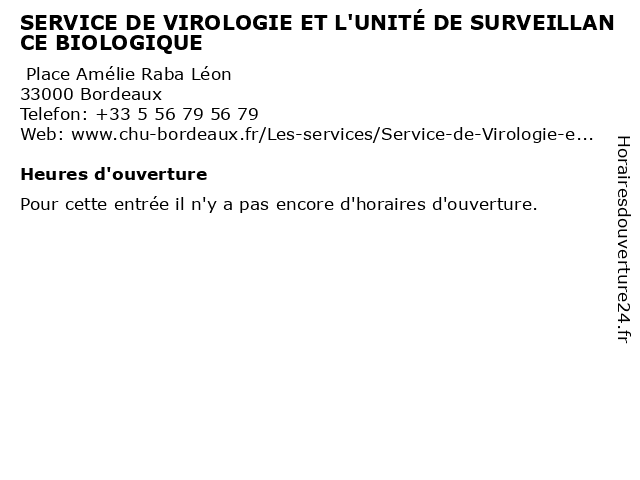 | Appeler SERVICE DE VIROLOGIE ET L'UNITÉ DE SURVEILLANCE BIOLOGIQUE | |