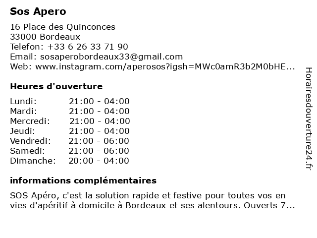 2 Auxilia - Groupe SOS (Distance: 0,99 km) 45 Cours d'Alsace Lorraine, 33000 Bordeaux auxilia, bordeaux, conseil, expert, groupe, socio-écologique, sos, transition 3 Wimoov - Groupe SOS (Distance: 2,26 km) 32 Rue de Tauzia, 33800 Bordeaux agglomération, association, bordelaise, groupe, mobilité, plateforme, sos, wimoov 4 Traiteur Happy Apero (Distance: 2,31 km) 36 Avenue Alsace Lorraine, 33200 Bordeaux apero, bar, bistro, bistrot, brasserie, café, happy, pub, restaurant, restauration, resto, traiteur 6 SOS Oxygène Atlantique Centre (Distance: 5,24 km) 8 avenue des Mondaults, 33270 Floirac agence, atlantique, centre, matériels, médical, oxygène, santé, soins, sos |