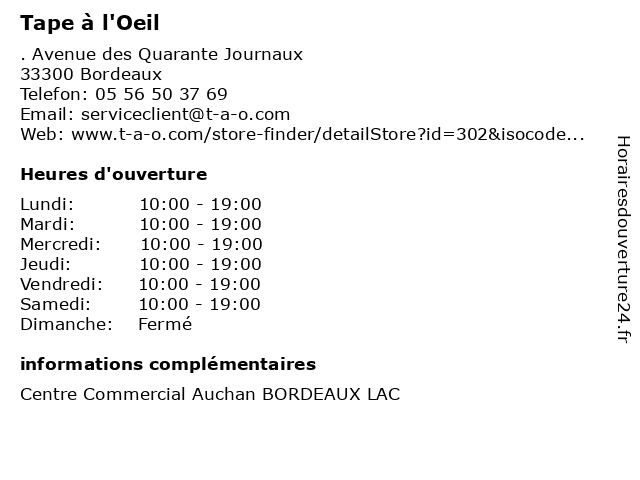 1 Tape à l'oeil - Bordeaux (Distance: 0,64 km) Avenue Des 40 Journaux, 33300 Bordeaux bordeaux, l'oeil, magasin de vêtements pour bébés, mode, tape 2 Grandir à vue d'oeil Bordeaux (Distance: 3,78 km) 8 Cours de Verdun, 33000 Bordeaux bordeaux, d'oeil, grandir, vue 3 Tape à L’Oeil (Distance: 4,05 km) . Centre Commercial, 33310 Lormont accessoires, beaute&sante, cafe, chaussures, enfants, l’oeil, mode femmes, mode hommes, optique, restaurant, service, sport, tape 5 Tape à l'oeil - Mérignac (Distance: 9,42 km) Zone Commerciale Chemin Long, 33700 Mérignac l'oeil, magasin de vêtements pour bébés, mode, mérignac, tape 6 Tape à l'oeil - Begles (Distance: 9,76 km) Cc Les Arches De L'estey, 33130 Begles begles, l'oeil, magasin de vêtements pour bébés, mode, tape |