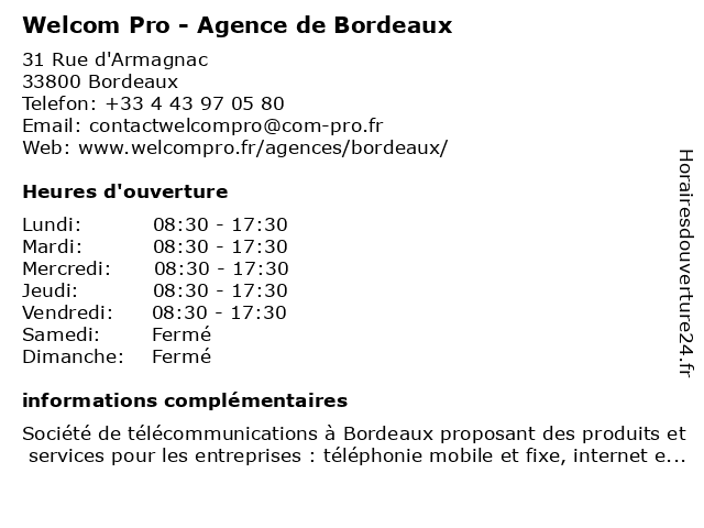 1 Welcom Pro - Agence de Bordeaux (Distance: 5,60 km) 5 Avenue Gay Lussac, 33370 Artigues-près-Bordeaux agence, bordeaux, de, pro, welcom 3 PRO BTP Bordeaux Bastide (Distance: 2,25 km) 42 B Rue des Nuits, 33100 Bordeaux agence, bastide, bordeaux, btp, mutuelle, pro 4 PRO BTP BORDEAUX BASTIDE (Distance: 2,28 km) 38 Rue de Nuits, 33100 Bordeaux bastide, bordeaux, btp, pro 5 Recycl'Inn Pro - Déchèterie Professionnelle (Distance: 3,30 km) 3 rue Louis Blériot, 33130 Begles bègles, dechets, déchèterie, elemination, pro, professionnelle, recycl'inn, recycl'inn pro, traitement, valorisation 6 Afro Style Pro (Distance: 3,46 km) 226 Rue d ornano, 33000 Bordeaux afro, beaute, coiffure, coiffures, pro, style, épilation |