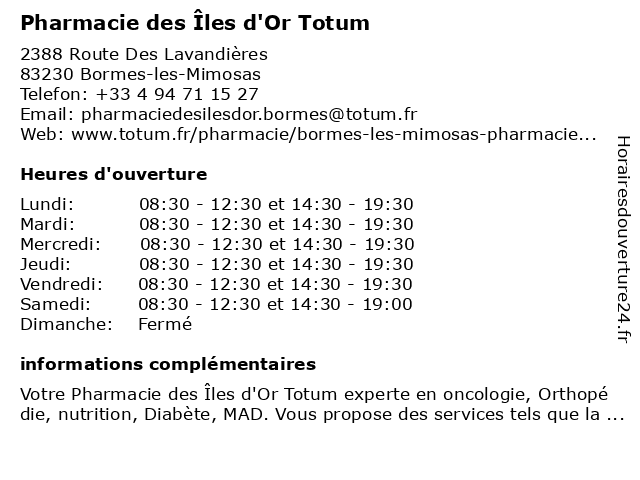 | Lundi | 08:30-12:30 et 14:30-19:30 |
