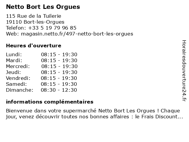 Bienvenue dans votre supermarché Netto Bort Les Orgues ! Chaque jour, venez découvrir toutes nos bonnes affaires : le Frais Discount, le Déstockage, les Alertes Discount, et plein d'autres pro...