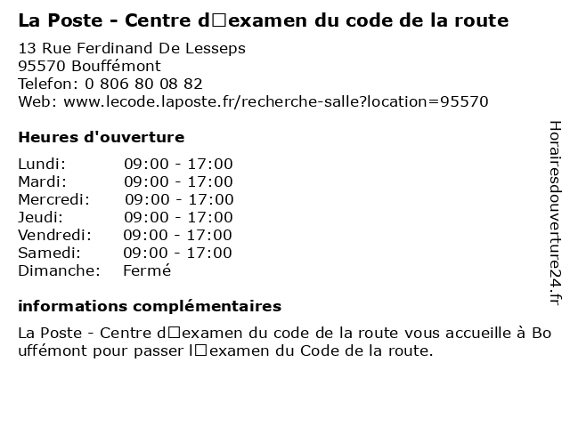 1 La Poste - Centre d’examen du code de la route (Distance: 1,93 km) 38 Avenue Jean Jaurès, 95330 Domont centre, centre d'évaluation scolaire, code, de, du, d’examen, la, poste, route, école technique 2 La Poste - Centre d’examen du code de la route (Distance: 3,46 km) 1 Rue Jacques Gallicher, 95460 Ezanville centre, centre d'évaluation scolaire, code, de, du, d’examen, la, poste, route, école technique 3 La Poste - Centre d’examen du code de la route (Distance: 5,98 km) 60 Rue D'ermont, 95390 Saint Prix centre, centre d'évaluation scolaire, code, de, du, d’examen, la, poste, route, école technique 4 La Poste - Centre d’examen du code de la route (Distance: 6,21 km) 11 Avenue Foch, 95160 Montmorency centre, centre d'évaluation scolaire, code, de, du, d’examen, la, poste, route, école technique 5 La Poste - Centre d’examen du code de la route (Distance: 6,74 km) 14 Avenue Du Général De Gaulle, 95230 Soisy Sous Montmorency centre, centre d'évaluation scolaire, code, de, du, d’examen, la, poste, route, école technique 6 La Poste - Centre d’examen du code de la route (Distance: 6,88 km) 14 Rue Carnot, 95200 Sarcelles centre, centre d'évaluation scolaire, code, de, du, d’examen, la, poste, route, école technique |
