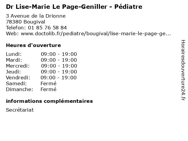 1 Dr Lise-Marie le Page-GeniIller - Pédiatre (Distance: 0,00 km) 3 Avenue de la Drionne, 78380 Bougival bebe, dr, geniiller, le, lise, marie, nourisson, page, pédiatre, pédiatrie 2 Dr Lise Delorme - Médecin généraliste (Distance: 3,31 km) - Centre Médical des Grandes Terres, 78160 Marly-le-Roi delorme, docteur, dr, generaliste, généraliste, lise, medical, médecin, soin 3 Anne-Lise Michon - Sage-femme (Distance: 3,82 km) 177 rue de Versailles, 78150 Le Chesnay anne, consultation, docteur, dr, femme, lise, med, michon, médecin, sage, traitement 4 Dr Anne-Lise Bron - Anesthésiste réanimateur (Distance: 9,59 km) 6 Square Jouvenet, 75016 Paris anesthésiste, anne, bron, clinique, de, docteur, dr, generaliste, générale, jouvenet, lise, medecin, ramsay, réanimateur, sante, santé 5 École élémentaire publique Arthur et Lise London (Distance: 11,95 km) 2 Rue Le Corbusier, 78280 Guyancourt arthur, artur, cours, education, et, lise, london, publique, services, école, élémentaire 6 |