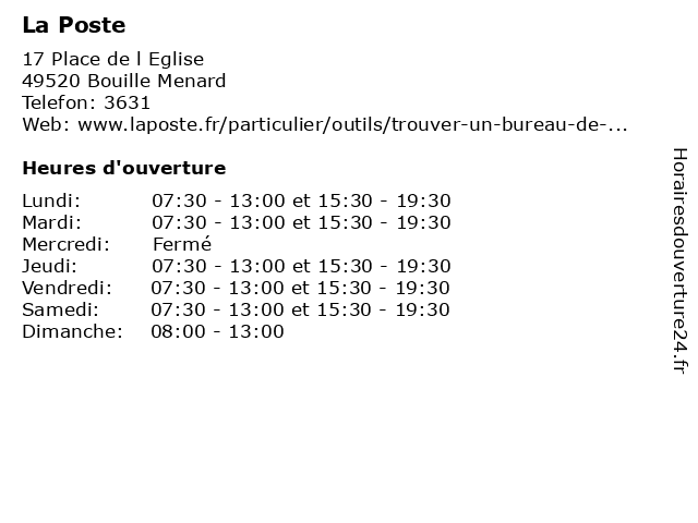 1 La Poste (Distance: 3,89 km) 23 Rue de Bretagne, 49520 Ombrée-d'Anjou agence, assurance, banque, banque postale, bureau de poste, chronopost, colis, courrier, dps, expéditions internationales, la, point, postale, poste, relais, timbres, téléphonie, ups, western union 2 La Poste (Distance: 4,47 km) - Rue Constant Gérard, 49520 Segré-en-Anjou Bleu colis, express chronopost, expédition, la, poste, réexpédition internationale, service, suivi du courrier 3 La Poste (Distance: 6,93 km) 5 Place de l'Église, 49520 Segré-en-Anjou Bleu agence, assurance, banque, banque postale, bureau de poste, chronopost, colis, courrier, dps, expéditions internationales, la, point, postale, poste, relais, timbres, téléphonie, ups, western union 5 La Poste (Distance: 12,55 km) 7 Place Jean Bruchet, 53800 La Selle-Craonnaise colis, express chronopost, expédition, la, poste, réexpédition internationale, service, suivi du courrier 6 La Poste (Distance: 13,41 km) 17 Rue d'Anjou, 49500 Segré-en-Anjou Bleu agence, assurance, banque, banque postale, bureau de poste, chronopost, colis, courrier, dps, expéditions internationales, la, point, postale, poste, relais, timbres, téléphonie, ups, western union |