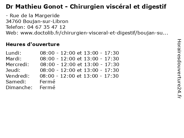 | Jeudi | 08:00-12:00 et 13:00-17:30 |