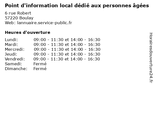 | Mercredi | 09:00-11:30 et 14:00-16:30 |