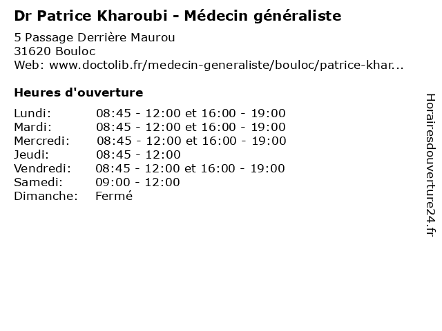 | Lundi | 08:45-12:00 et 16:00-19:00 |