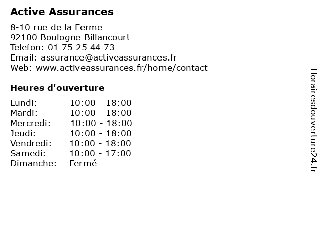 1 ACTIVE ASSURANCESAVASSUR M NACCACHE DIDIER (Distance: 0,02 km) 8 R Ferme, 92100 BOULOGNE BILLANCOURT active, assurancesavassur, didier, naccache 3 Activimo - Active Gestion Michel Szemzo (Distance: 6,27 km) 50 rue Babylone, 75007 Paris a.g.m.s., active, activimo, agence immobilière, gestion, michel, szemzo, ventes et locations 5 GMF Assurances (Distance: 6,76 km) Voie de I'Horlogerie, 92800 Puteaux assurance auto, assurance habitation, assurance santé, assurances, crédit, devis en ligne, gmf, prise de rendez-vous, prévoyance, épargne 6 France Active Val d'Oise Yvelines (Distance: 8,69 km) 23 Avenue de Paris, 78000 Versailles active, création, d'oise, entreprise, france, reprise, territoire, val, yvelines |