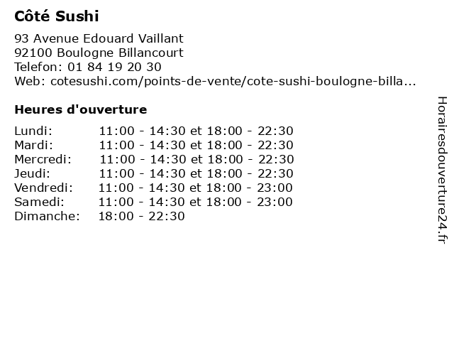 3 Côté Sushi (Distance: 6,10 km) 61 Avenue du Général Leclerc, 75014 Paris côté, restauration, sushi, sushis 4 Côté Sushi (Distance: 7,57 km) 35 Boulevard Haussmann, 75009 Paris cold dishes, côté, dessert, drink, hot meals, maki, menu, roll's, sushi, tataki sashimi, tea 5 Côté Sushi (Distance: 10,95 km) 33 rue Eugénie Eboué, 92600 Asnières sur Seine côté, japonais, makis, restaurant, sushi 6 Sun Sushi (Distance: 0,15 km) 187 Boulevard Jean Jaures, 92100 Boulogne Billancourt restaurants, sun, sushi |