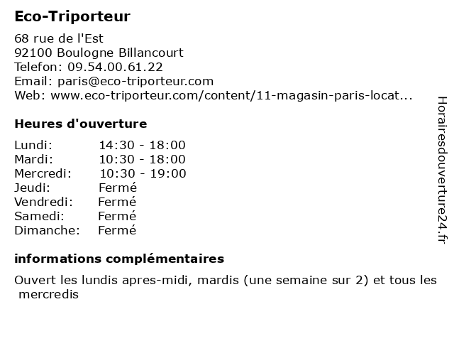 1 Eco-Triporteur (Distance: 9,59 km) 50 rue Championnet, 75018 Paris cargo, eco, entretien, réparation, triporteur, vélo 2 ECO DEPANNAGE A DOMICILE - 92100 (Distance: 1,24 km) 21 Avenue du Général Leclerc, 92100 Boulogne-Billancourt 92100, depannage, domicile, eco 3 Eco Electricien (Distance: 3,58 km) 366 Ter rue Vaugirard, 75015 Paris chauffage, dépannage, eco, electricien, installation, rénovation, sécurité, Électricité 4 Eco Pro Ascenseurs (Distance: 4,30 km) 14 Boulevard Raymon Poincaré, 92380 Garches ascenseurs, eco, installation, maintenance, modernisation, pro 6 Pour l'Eco (Distance: 6,75 km) 170b Boulevard du Montparnasse, 75014 Paris l'eco, magazine, paris, pour, périodique, revue, économie |