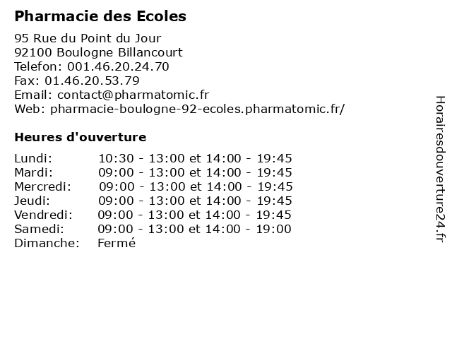 | Mercredi | 09:00-13:00 et 14:00-19:45 |