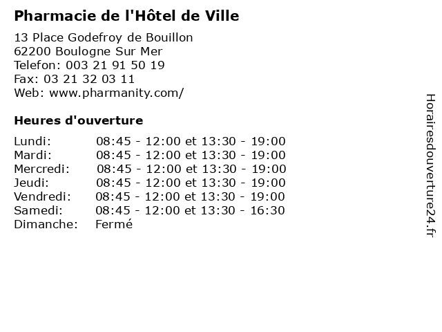 | Lundi | 08:45-12:00 et 13:30-19:00 |