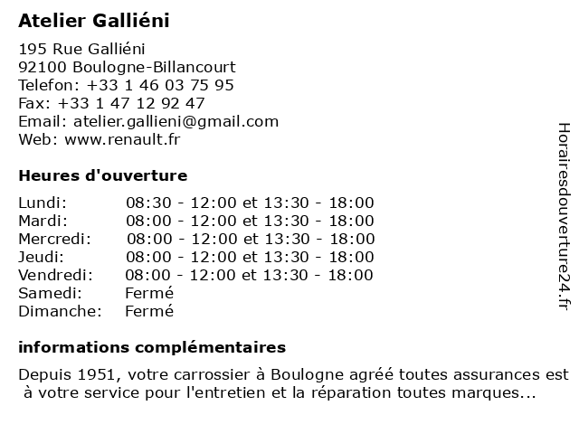 1 Atelier De Dépannage (Distance: 0,03 km) 197 Rue Gallieni, 92100 Boulogne-Billancourt atelier, de, dépannage 2 L'Atelier Emma et Chloé (Distance: 0,48 km) 5 rue Tony Garnier, 92100 Boulogne-Billancourt bijouteries, bijoux, bracelets, chloé, diamant, emma, et, l'atelier, or 3 Atelier Laurent Cayron - Architecture d'intérieur (Distance: 0,50 km) 5 Rue de Sèvres, 92100 Boulogne-Billancourt architecte, architecture, atelier, cayron, conception, d'intérieur, design, intérieur, laurent, urbanisme 4 Renault Retail Group (Atelier Mecanique) (Distance: 0,54 km) 577 Avenue General Lerclerc, 92100 Boulogne-Billancourt atelier, automobiles, garage, group, mecanique, motos - concessionnaire, renault, retail 5 Renault Retail Group (Atelier Reparation Z.E.) (Distance: 0,54 km) 577 Avenue General Lerclerc, 92100 Boulogne-Billancourt atelier, automobiles, garage, group, motos - concessionnaire, renault, reparation, retail, z.e. 6 Atelier NA - Costume sur Mesure (Distance: 0,57 km) 144 Route de la Reine, 92100 Boulogne-Billancourt atelier, boulogne, cabine 3d, chemise sur mesure, costume, costume 3 pièces, costume de mariage, costume sur mesure, manteau sur mesure, mesure, na, smoking sur mesure, sur, sur mesure, vêtements pour hommes |