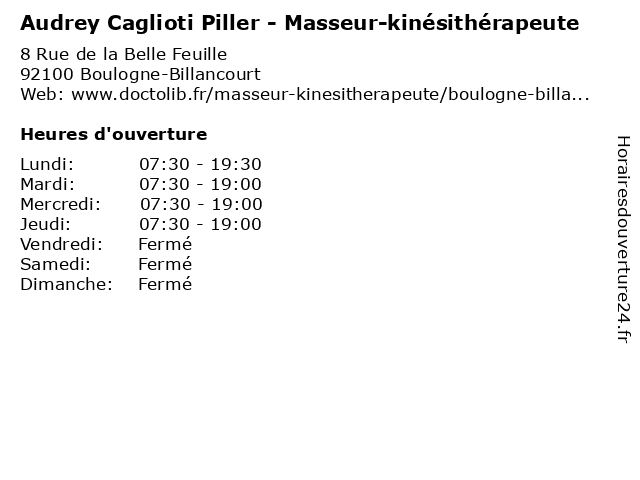 1 Audrey Budakci - Diététicienne (Distance: 0,33 km) 54 Boulevard Jean Jaurès, 92100 Boulogne-Billancourt actes et symptômes, audrey, budakci, diététicienne, expertises, micronutrition, Éducation au diabète 2 Dr Audrey Benguigui - Pneumologue (Distance: 2,76 km) 14-16 Rue Pasteur, 92210 Saint-Cloud audrey, benguigui, dr, médecin, médical, pneumologie, pneumologue 3 Dr. Audrey Benguigui - Dentiste (Distance: 3,76 km) 18 Place du Commerce, 75015 Paris audrey, benguigui, dentiste, docteur, dr., medecins, sante 4 Audrey Yargui - Chiropracteur - Secretariat (Distance: 3,78 km) 33 Rue Ledru Rollin, 92150 Suresnes audrey, chiropracteur, medical, ostéopathique, secretariat, thérapie, yargui 5 Audrey Ahovey - Hypnothérapeute (Distance: 3,99 km) 74 Rue de l'Abbé Groult, 75015 Paris ahovey, audrey, hypno, hypnose, hypnothérapeute, sante 6 Audrey Bauchet - Diététicienne (Distance: 4,07 km) 54 Rue de Verdun, 92150 Suresnes aliment, audrey, bauchet, dieticien, diététicienne, medecin, nutrition |