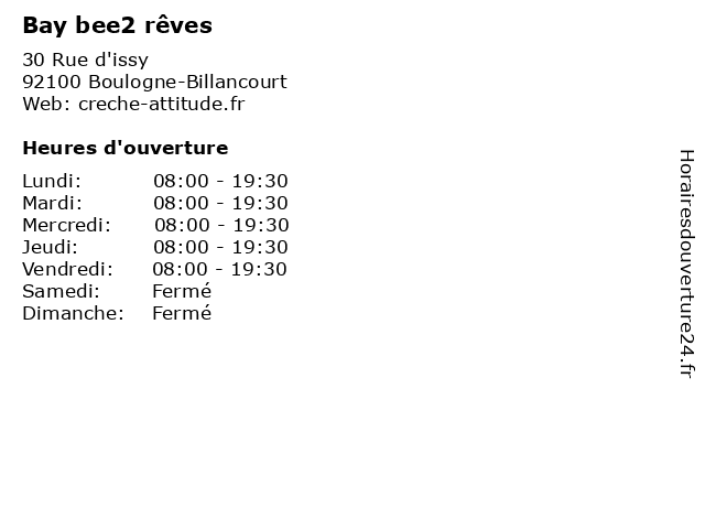 | Lundi | 08:00-19:30 |
