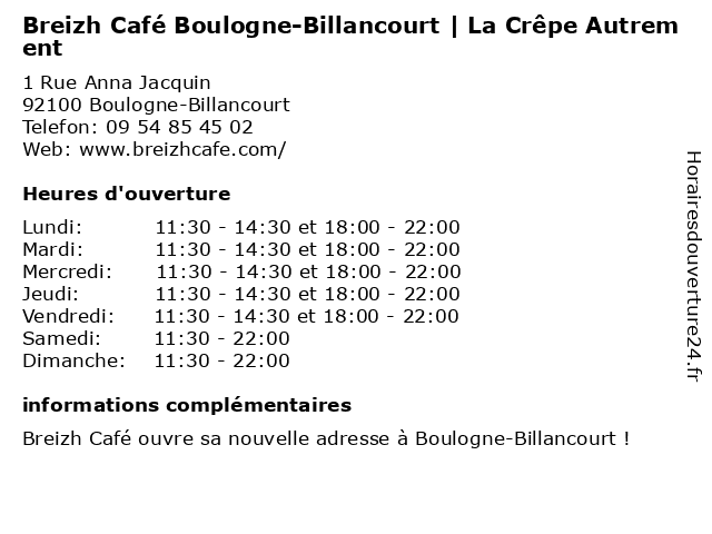 | Mercredi | 11:30-14:30 et 18:00-22:00 |
