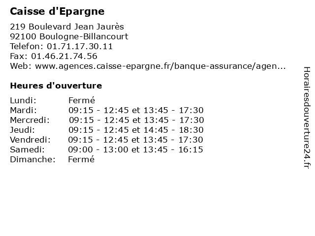 1 Caisse d'Epargne (Distance: 0,66 km) 58 Avenue Emile Zola, 92100 Boulogne-Billancourt assurances, banques, caisse, d'epargne, services 2 Caisse d'Epargne (Distance: 0,68 km) 145 Rue Gallieni, 92100 Boulogne-Billancourt assurances, banques, caisse, d'epargne, services 3 Caisse d'Epargne (Distance: 0,85 km) 211 Rue du Vieux Pont de Sèvres, 92100 Boulogne-Billancourt assurances, banques, caisse, d'epargne, services 4 Caisse d'Epargne (Distance: 1,44 km) 16 Bis Boulevard Jean Jaures, 92100 Boulogne-Billancourt assurances, banques, caisse, d'epargne, services 5 Caisse d'Epargne (Distance: 2,19 km) 9 Rue De L'eglise, 92210 Saint-cloud assurances, banques, caisse, d'epargne, services 6 Caisse d'Epargne (Distance: 2,23 km) 4 Avenue Victor Cresson, 92130 Issy-les-Moulineaux assurances, banques, caisse, d'epargne, services |