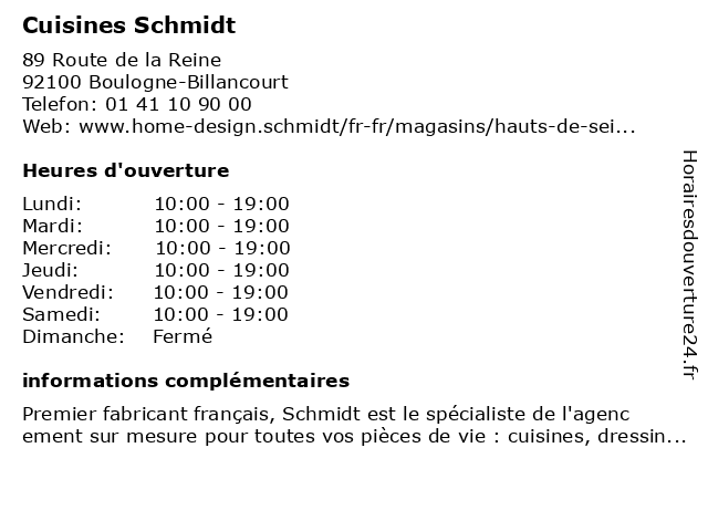 1 Cuisines Schmidt (Distance: 1,44 km) 83 Avenue Charles de Gaulle, 92200 ChavilleNeuilly-sur-Seine cuisines, meubles, schmidt, électroménage 2 Cuisines Schmidt (Distance: 3,28 km) 2 bis rue Diderot, 92150 Suresnes cuisine, cuisines, cuisiniste, dressing, magasin, meubles, salle de bain, schmidt 3 Cuisines Schmidt (Distance: 4,01 km) 358 Rue de Vaugirard, 75015 Paris aménagement, cuisine, cuisines, cuisiniste, intérieur, maison, meubles, schmidt, équipement 4 Cuisines Schmidt (Distance: 8,82 km) 36 Rue Carnot, 78000 Versailles aménagement, cuisine, cuisines, cuisiniste, intérieur, schmidt, équipement 5 Cuisines Schmidt (Distance: 9,88 km) 45 Boulevard Emile Zola, 78800 Houilles aménagement, cuisine, cuisines, cuisiniste, intérieur, schmidt, équipement 6 Cuisines Schmidt (Distance: 11,28 km) 132 Boulevard Carnot, 78110 Le Vesinet aménagement, cuisine, cuisines, cuisiniste, intérieur, schmidt, équipement |