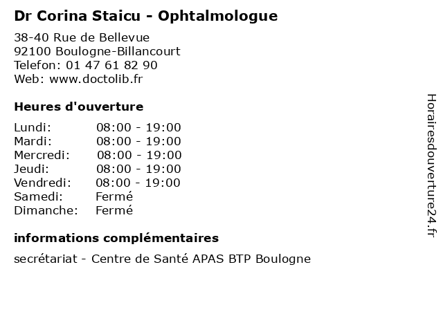 1 Dr Corina Staicu - Ophtalmologue (Distance: 5,86 km) 77 Esplanade du Général de Gaulle, 92800 Puteaux corina, dr, ophtalmologie, ophtalmologistes, ophtalmologue, staicu, vision 2 Dr Corina Radoi - Ophtalmologue (Distance: 2,36 km) 21 Rue Chanez, 75016 Paris consultation, corina, docteur, dr, med, médecin, médecine, ophtalmologue, radoi, secrétariat, traitement 3 Dr Caroline Laurent-Coriat - Ophtalmologue (Distance: 3,26 km) 10 Boulevard Raymond Poincaré, 92380 Garches caroline, coriat, dr, laurent, ophtalmologie, ophtalmologistes, ophtalmologue, vision 4 Dr Dominique Gotte Bouley - Ophtalmologue (Distance: 5,78 km) 37 Rue des Volontaires, 75015 Paris bouley, dominique, dr, gotte, médecin, médecine, médical, ophtalmologue, pharmaceutique, traitement 5 Dr Frédérique Rougelet-Zivy - Ophtalmologue (Distance: 5,78 km) 37 Rue des Volontaires, 75015 Paris dr, frédérique, médecin, médecine, médical, ophtalmologue, pharmaceutique, rougelet, traitement, zivy 6 Dr Ahmed Beddiaf - Ophtalmologue (Distance: 6,32 km) 207 Jardins de l'Arche, 92000 Nanterre ahmed, beddiaf, dr, ophtalmologie, ophtalmologistes, ophtalmologue, vision |