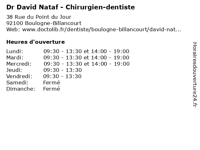 1 Dr Yvon Nataf - Chirurgien-dentiste (Distance: 0,00 km) 38 Rue du Point du Jour, 92100 Boulogne-Billancourt chirurgien, dent, dentiste, docteur, dr, nataf, soins, yvon 2 Jean-Louis David (Distance: 0,88 km) 202 Boulevard Jean Jaurès, 92100 Boulogne Billancourt coiffeur, david, jean, louis, mixte 3 Jean Louis David (Distance: 0,93 km) 179 Avenue de Versailles, 75016 Paris beaute, coiffure, david, jean, louis 4 Jean-Louis David (Distance: 1,24 km) 5 Rue Tony Garnier, 92100 Boulogne-Billancourt alimentation, beauté & sante, culture & loisirs, david, enfants, high-tech, jean, louis, maison & déco, mode, restaurants 5 Dr Norbert Nataf - Chirurgien-dentiste (Distance: 1,64 km) 77 Allée du Forum, 92100 Boulogne-Billancourt chirurgien, dentaire, dentiste, dr, implantologie, nataf, norbert, parodontologie 6 David Bismuth - Audioprothésiste (Distance: 1,93 km) 50 Rue Vasco de Gama, 75015 Paris audiologiste, audioprothésiste, auditifs, audition, bismuth, david |