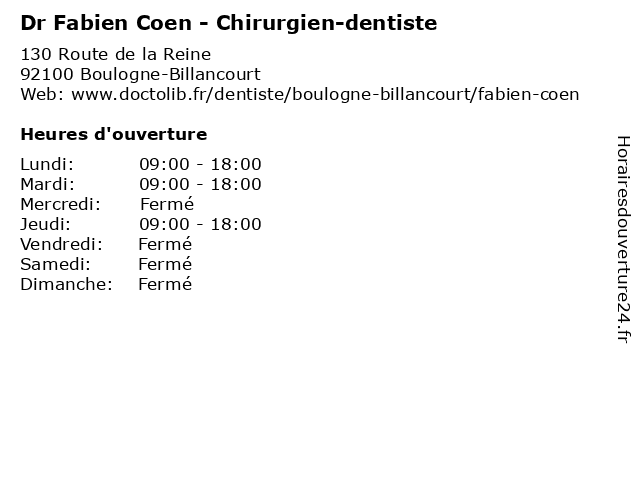 1 Elisa Coen - Psychologue (Distance: 0,00 km) 130 Route de la Reine, 92100 Boulogne-Billancourt coen, elisa, folie, psychiatre, psychiatrie, psychiatrique, psychologue 2 Dr. Fabien Vermelle-Dentiste (Distance: 4,89 km) 98 Avenue Kleber, 75016 Paris consultation, dentiste, docteur, dr., fabien, santé, vermelle 3 Maître Stephanie Coen - Avocate (Distance: 8,43 km) 12 rue Notre-Dame des Victoires, 75002 Paris avocate, avocats, cabinet, coen, conseils, contentieux, juridique, justice, litiges, maître, services, stephanie 4 Dr Fabien Pourreau - Dentiste (Distance: 8,79 km) 8 Rue Augustin Mouchot, 75013 75013 Paris care, clinic, dentist, dentiste, dr, fabien, france, health, pourreau, service 5 Benjamin Coen - Chiropracteur (Distance: 9,33 km) 79 Rue Notre Dame de Nazareth, 75003 Paris benjamin, chiropracteur, chiroprateur, chiropraticien, coen, sante, soins 6 Images & Portraits | fabien breuvart photographie (Distance: 9,74 km) 37 Rue Charlot, 75003 Paris breuvart, business, fabien, images, photographie, photography, portraits, services, studios |