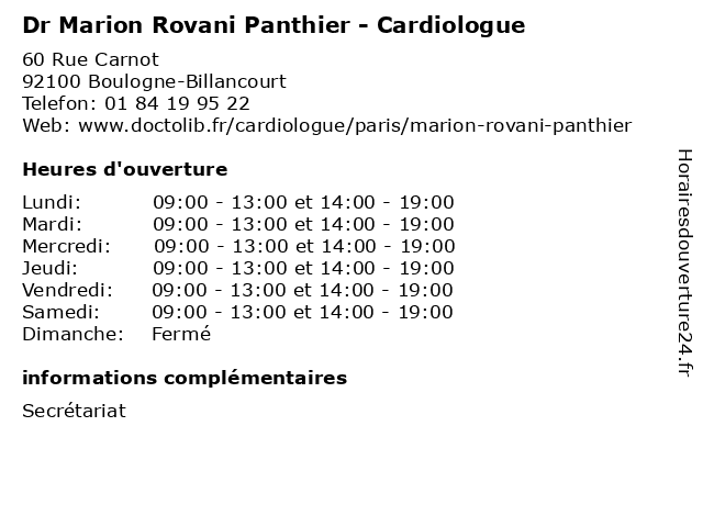 1 Dr Marion Rovani Panthier - Cardiologue (Distance: 7,95 km) 3 Rue Bernoulli, 75008 Paris bernoulli, cabinet, cardio, cardiologie, cardiologue, centre, coeur, dr, et, marion, médical, panthier, rovani, santé 2 Dr Marion Rieutord - Psychiatre (Distance: 0,00 km) 60 Rue Carnot, 92100 Boulogne-Billancourt dr, folie, marion, psychiatre, psychiatrie, psychiatrique, rieutord 3 Dr Besma Sidia - Cardiologue - secretariat (Distance: 0,00 km) 60 Rue Carnot, 92100 Boulogne-Billancourt besma, cardiologue, dr, médecin, médecine, médical, pharmaceutique, secretariat, sectretariat, sidia, traitement 4 Dr Richard Amoretti - Cardiologue - secretariat (Distance: 0,00 km) 60 Rue Carnot, 92100 Boulogne-Billancourt amoretti, cardiologue, dr, médecin, médecine, médical, pharmaceutique, richard, secretariat, sectretariat, traitement 5 Dr Meidi El Issa - Cardiologue - secretariat (Distance: 0,00 km) 60 Rue Carnot, 92100 Boulogne-Billancourt cardiologue, dr, el, issa, meidi, médecin, médecine, médical, pharmaceutique, secretariat, sectretariat, traitement 6 Dr Ardalan Sharifzadehgan - Cardiologue (Distance: 0,00 km) 60 Rue Carnot, 92100 Boulogne-Billancourt ardalan, cardio, cardiologie, cardiologue, coeur, dr, sharifzadehgan |