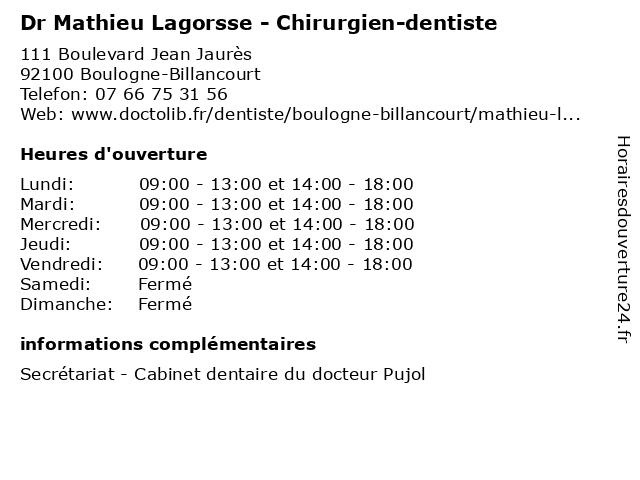 1 Dr Jean-Mathieu Pujalte - Anesthésiste (Distance: 0,34 km) 105 Avenue Victor Hugo, 92100 Boulogne-Billancourt anesthésiste, consultation, docteur, dr, jean, mathieu, med, médecin, médecine, pujalte, secrétariat, traitement 2 Mathieu Boileau - Hypnothérapeute (Distance: 0,51 km) 201 Boulevard Jean Jaurès, 92100 Boulogne-Billancourt boileau, hypnose, hypnotherapeute, hypnothérapeute, mathieu, sante, soins 3 Mathieu Boileau - Hypnothérapeute (Distance: 0,55 km) 3 Avenue Desfeux, 92100 Boulogne-Billancourt boileau, d'hypnose, hypnothérapeute, mathieu, pnl, techniques 4 Dr Alexandre Mathieu - Chirurgien plasticien et esthétique (Distance: 0,55 km) 3 Avenue Desfeux, 92100 Boulogne-Billancourt alexandre, chirurgien, consultation, docteur, dr, esthétique, et, mathieu, med, médecin, médecine, plasticien, secrétariat, traitement 5 Mathieu Kimpe - Chiropracteur (Distance: 0,96 km) 119 Avenue André Morizet, 92100 Boulogne-Billancourt chiro, chiropracteur, kimpe, mathieu, sante, soins 6 Mathieu Saby - Ostéopathe (Distance: 1,12 km) 34 Avenue du Général Sarrail, 75016 Paris mathieu, ostéo, ostéopathe, ostéopathes, saby, soins |